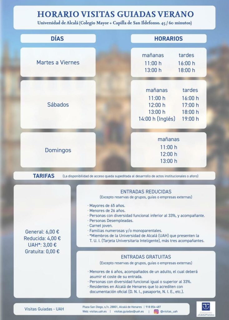 El Servicio de Visitas Guiadas de la Universidad de Alcalá ofrece, de martes a domingo, un recorrido por el patrimonio de la institución dando vida a sus 500 años de historia. Estas visitas se dirigen a público general y son accesibles. En ellas enseñaremos el primer campus del mundo, en una visita guiada de 45/60 minutos, donde les enseñaremos: